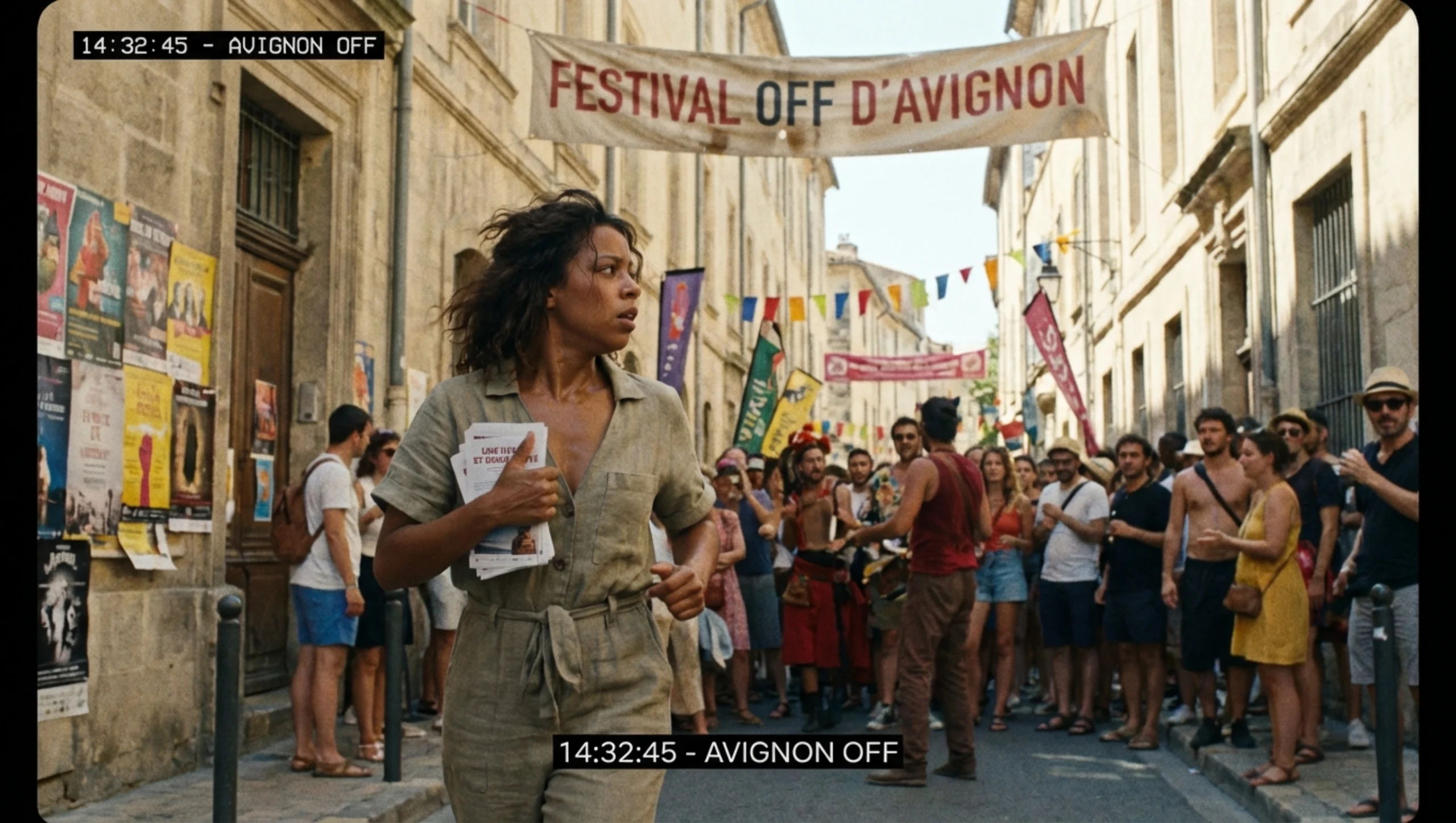 L’intrigue suit Mathilde, comédienne de 35 ans qui se bat pour joindre les deux bouts, plongée dans le chaos du Festival Off d’Avignon en plein mois de juillet : trop de spectacles, trop de monde, trop de chaleur, et seulement une heure et demie pour courir d’un théâtre à l’autre.